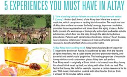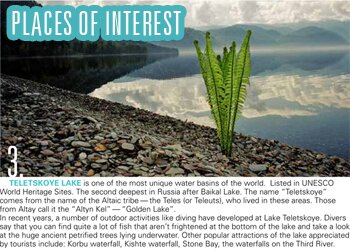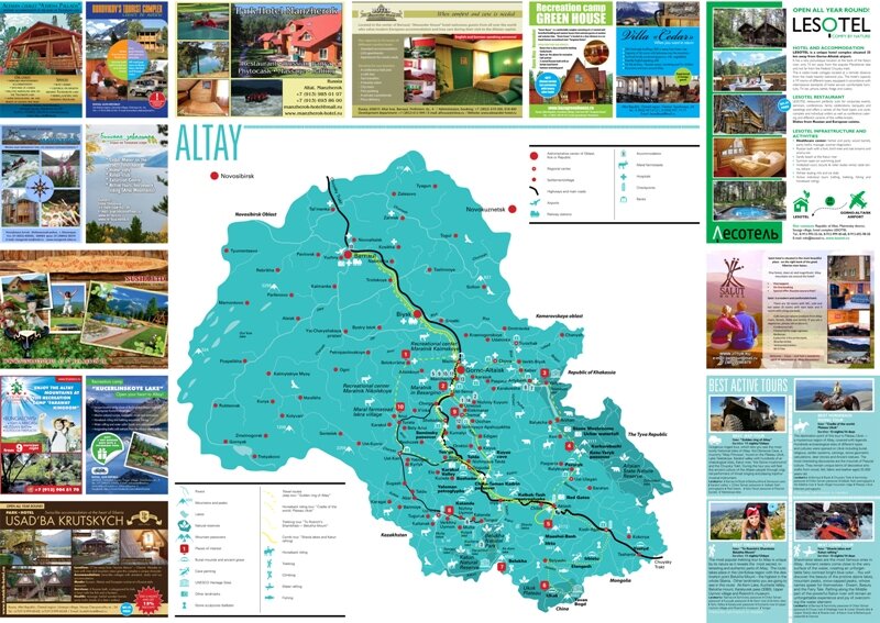 In order to make staying in Altay mostly intensed and full of emotions the map's organizers gave the recommendations of "5 BEST experiences to visit in Altay": taking healing panty bathes, buying honey, having Russian steam bathes, listening to Kaichi songs and visiting Shamans. For every foreign tourists the TOP-10 Russian prhases are given.
